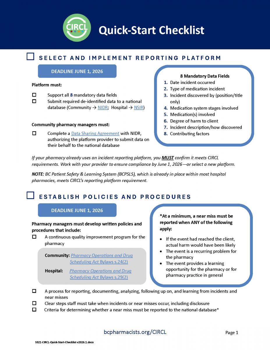 The checklist is intended to be an easy-to-use reference that pharmacies can view online or print and keep on hand while working through the transition to CIRCL. It walks pharmacies through the key steps required, including confirming that incident reporting platforms meet CIRCL requirements, establishing policies and procedures, training staff, holding regular team meetings, and completing safety self-assessments.